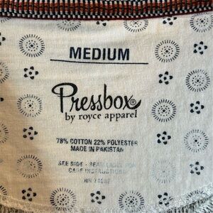 This Pressbox pullover sweater comes in a medium size. It features a gray color with a graphic print of the Missouri Tigers, making it ideal for sports and college-themed occasions. The sweater is made from a blend of cotton and polyester, ensuring comfort and durability. It has a regular fit with long sleeves, perfect for casual wear during the fall season. The garment is machine washable for easy care. This vintage piece is pre-owned but in excellent condition.