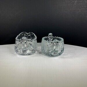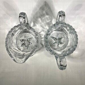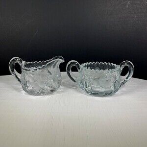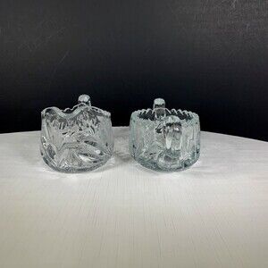 Pressed Cut Etched Sugar Creamer Heavy Glass Set Mid Century Vintage 1960s. Measures approx. 3” tall.