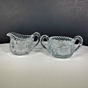 Pressed Cut Etched Sugar Creamer Heavy Glass Set Mid Century Vintage 1960s