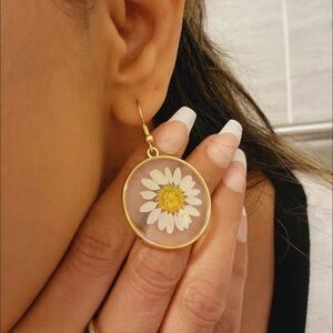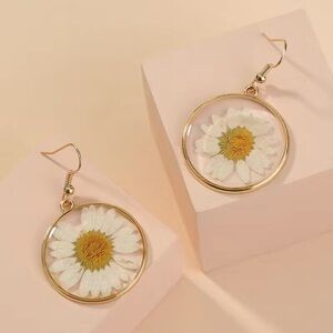 Pressed Floral Daisy Dangle Drop Gold Boho Dried Flower Resin Earrings NWT