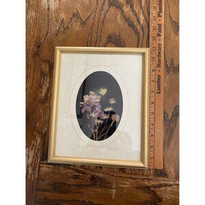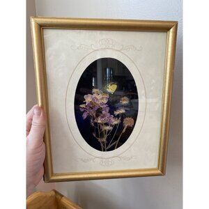 This vintage pressed flower and butterfly artwork showcases a delicate arrangement of florals and a butterfly encased in an oval matting. Housed in an elegant gold-tone frame, it evokes a sense of timeless beauty and nostalgia for nature-inspired decor. A gentle addition to any wall or display.