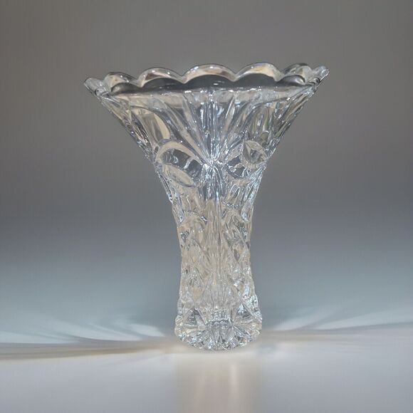 This beautiful, pressed glass vase is a stunning addition to any home decor. With a fluted top and clear color, it's perfect for displaying flowers with pineapple base. Measuring 8 inches tall and weighing 3 lbs, this bud vase is a vintage piece that will add a touch of cottage core style to your living space.
