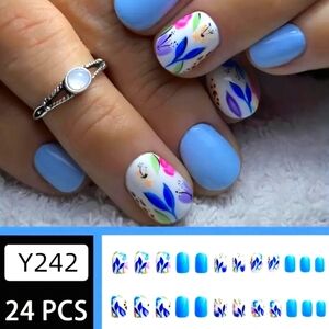 Enhance your style with this vibrant floral nail art set. Featuring a stunning blue base with multicolor floral designs, this set is perfect for Easter or any occasion.