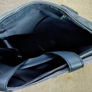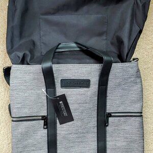 This versatile Over The Shoulder Tote (approx. 13"W x 15"L) is packed with features: two front zippered pockets for extra quick access, detachable strap for shoulder or hand carry, secure zipper closure, additional exterior front pocket, back sleeve slides over luggage handles, and interior zip pocket & open pocket. This bag is brand new, never used, and comes in its original packaging.