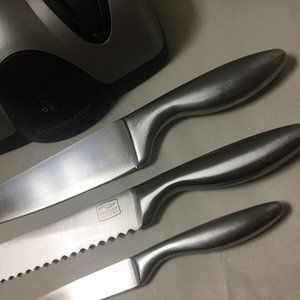 Presto Eversharp electric sharpener & 3 Chicago Cutlery chef knives