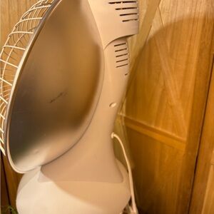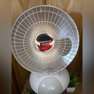 Presto HeatDish parabolic electric heater in silver and white. Efficient and stylish heating solution.