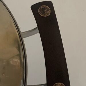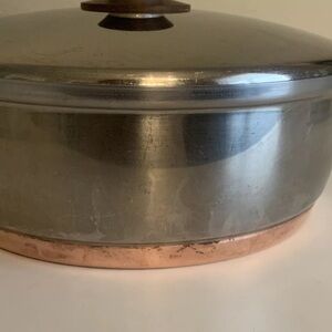 Good condition Presto Pride Copper Botton double handle sauce pot. Shows some discoloration due to use and age. This will last for many many more years to come.