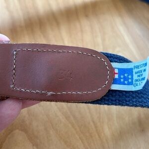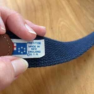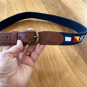 Preston Code Flag Belt Navy. Finished with leather tabs and solid brass buckle. Code flags on navy webbing. Made in the USA. Size 34