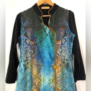 Long sleeve. Pullover sweater dress. Multicolor of blue. Button on the front. Underarm to underarm