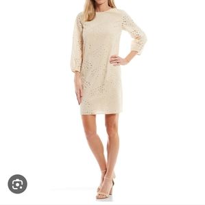 Preston & York 3/4 Sleeves Eyelet Cream Mini Sheath Dress Size 14. Fully lined. Gently used with no holes rips or stains! 1/4 zip back.