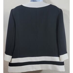 black with white contrasting trim, hook & eye closure, lined, lightweight, round neck, 3/4 sleeves, soft