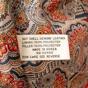 A vintage-inspired genuine suede jacket with a relaxed, oversized fit. Features a stylish high collar with adjustable toggles, functional pockets, and a unique patterned lining. Perfect for layering in cooler weather.