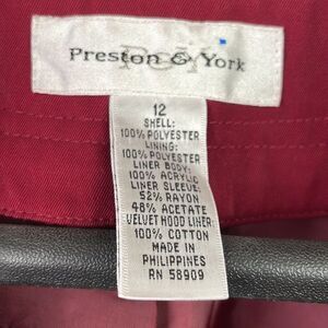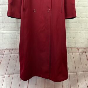 Preston & York Long Red Double-Breasted Trench Coat. Women's Size 12. Beautiful condition. Red burgundy or wine color. Fully lined. See tags in pic for material content. Excellent preowned condition. Button-on hood is not available. Front pockets. Rear vent