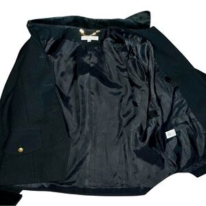 Preston & York 100% worsted wool jacket/blazer size 12 gold buttons fully lined trimmed with soft fur like fabric on cuffs and collar split tail detail front see photos for measurements