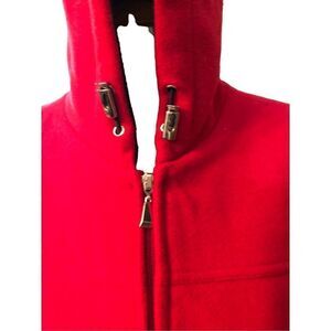 Preston & York red hooded pure wool front zip coat. Size 16. Two functional front pockets with button closures. Hood has elastic to tie for neck coverage. Please see pictures, there are a few flaws in the wool, but they are barely noticeable, if at all unless looking for them. Coat is fully lined. Classic vintage pea coat.