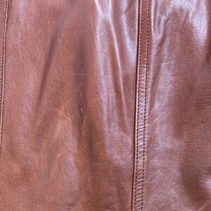 Preston &York chestnut leather waist/hip length jacket with fur collar. Fitted waist detail with snap closures. Side zip pockets .satin lined. Show stopping with jeans and boots. SzM