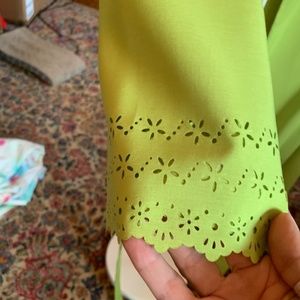 A dark citrus light jacket with eyelet cuffs and bottom. Belt. Hook snd eye closures on the jacket poly material. Great over a dress