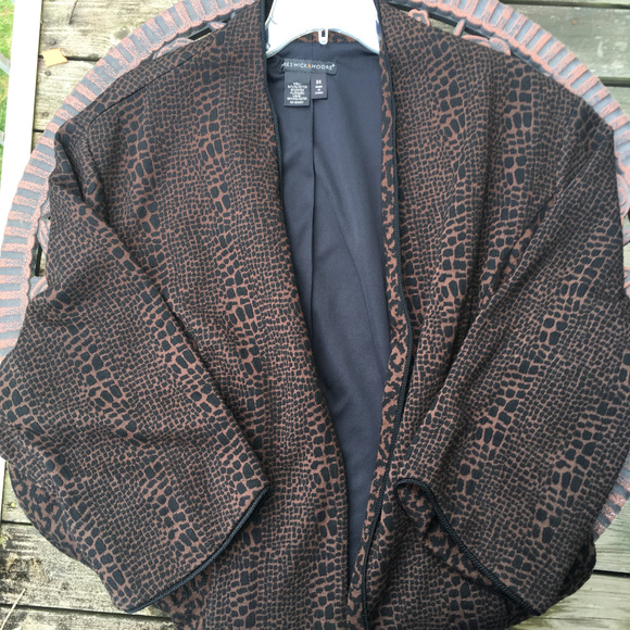 This is a really heavy, warm cardigan. It's SO cozy--great for cold winter days. The detail shot is a bit light color-wise; what you see of the pattern in the tag photo is more accurate. Poly/rayon/spandex.
