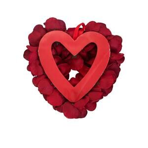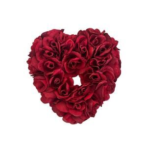 This is a pretty 13" red heart-shaped wreath adorned with artificial roses, glitter and shimmery accents. The wreath features a theme of hearts and is ideal for hanging on a door as a decorative piece. The artificial roses give a vibrant red color to the wreath, adding a festive and romantic touch to any space.