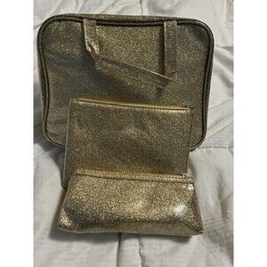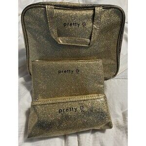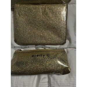 Pretty 3 Piece Make-up Bag Set Gold Glittery Pouch Cosmetic