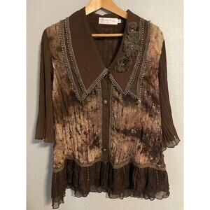 Design details: Button front with decorative buttons; oversized pointed collar with floral appliqué; embellished beaded/chain trim; crinkled/pleated texture through body; pleated chiffon 3/4 sleeves; lace and ruffle hem with metallic trim accents