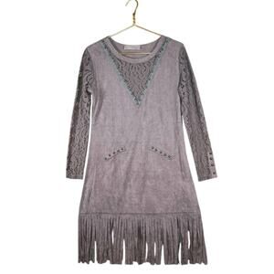 Pretty Angel Gray Linen Cotton Blend Fringe Western Boho Tunic Dress | M/L