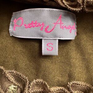 Whispering tales of elegance and grace, this Pretty Angel top drapes you in an intricate lace dance. The ruffled neckline echoes romantic whispers of a bygone era, while the olive green hue connects you to nature’s gentle embrace. A delicate blend of silk, polyester, and cotton, it promises comfort and allure.