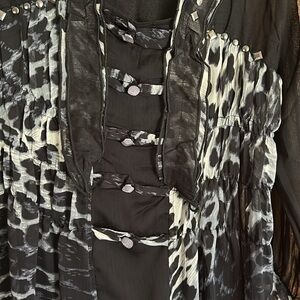 Unique and whimsical vintage blouse by Pretty Angel, featuring a sheer layered design in black with mixed animal prints, romantic ruffles, and lace-up front accents. This statement top blends whimsygoth, gypsy bohemian, and Y2K aesthetics—perfect for lovers of vintage flair, soft grunge, or festival-ready fashion.