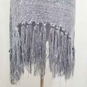 Pretty Angel sleeveless knit sweater tank. Gray and metallic silver linen blend knit. Woven with metallic silver rainbow iridescent sequins. Long fringe trim. Scoop neck. Cutout holes in back. Size small.