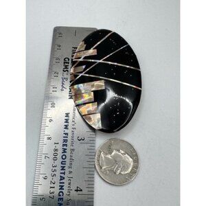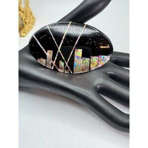 Pretty Black And Multicolor Inlay Design Modernist Brooch Over Silver Tone Metal