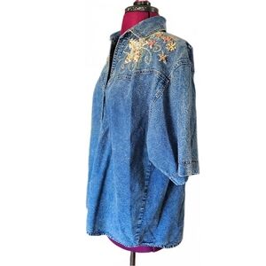 This vintage denim button-up is a unique addition to any wardrobe.