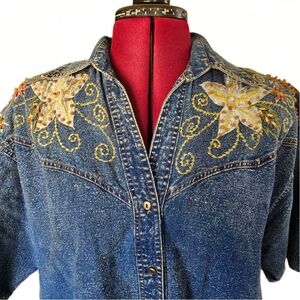 vintage, vntg, cottagecore, grannycore, grandmacore, fun, unique, denim, jean, retro, layering, layer, blue, embroidered, embroidery, stitched, beaded, beaded accents, fast shipping