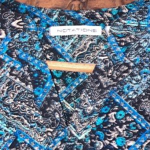 Like new! V neck with roll up sleeves with button tabs. Slightly longer shirt tail in back. Black with shades of blue.
