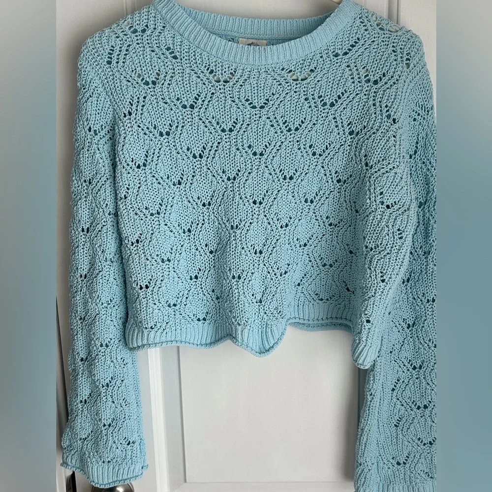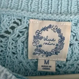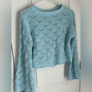 Pretty pale blue Size is Medium Length from shoulders 16” Wide long sleeves 100% polyester