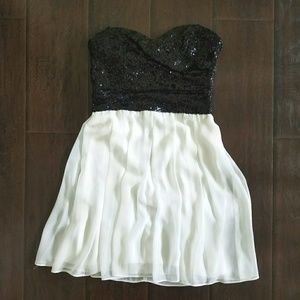 This pretty little strapless dress features a sweetheart neckline, black sequins on top & off white chiffon on the bottom. Perfect for a special occasion. Approximately 27" from top to bottom. NWOT.