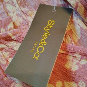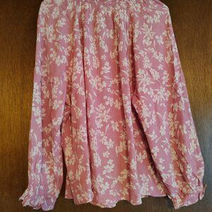 Flattering and feminine Spring top. The material is cool and the color is called lilac which is a pretty pinkish color. Goes with beige, black or even denim.