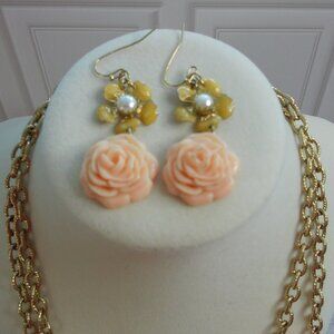 Matching statement floral necklace and pierced dangle earrings. Gold tone with pearl and rhinestone accents. In excellent condition with no signs of wear.