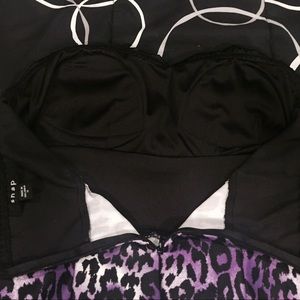 Floral leopard strapless dress with black, vibrant purples, turquoise, and lime green. Has built in cups so no need for a bra! Black silk-like tie back. Working zipper, and only worn twice. Size 11!