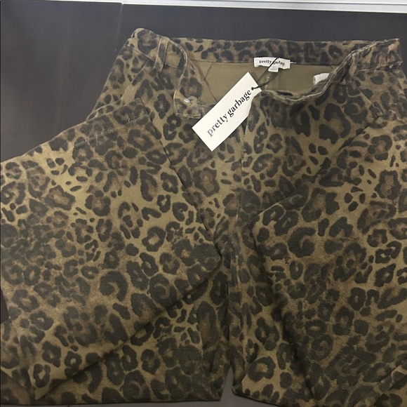 Chic leopard print pants by Pretty Garbage. Features a striking animal pattern in brown and black.