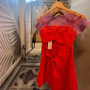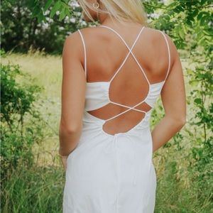Pretty Garbage Ruched Poplin Mini Dress with double spaghetti straps and open tie back.