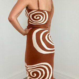 Never before worn. Knit bodycon dress with swirl design. Adjustable spaghetti straps. Midi length