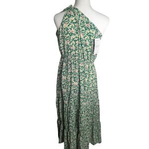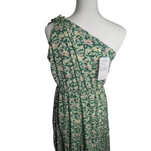 This Prettygarden one-shoulder floral maxi dress features a green base with a charming floral print in shades of pink, white, and yellow. Made from a comfortable 97% polyester and 3% elastane blend, this dress is perfect for summer outings, garden parties, or beach vacations. The flowy design and one-shoulder detail offer a relaxed yet stylish look, ideal for warm-weather occasions. The dress measures approximately 16 inches across the chest, 51 inches long, and 13 inches across the waist (laid flat and not stretched).