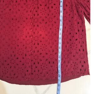 Wear this like-new maroon Pretty Garden V-neck top to your casual or dressy holiday gathering. The hollow out eyelet lace and embroidered blouse is fully-lined through the bodice while the sleeves are open. 100% cotton with polyester lining. Machine wash.