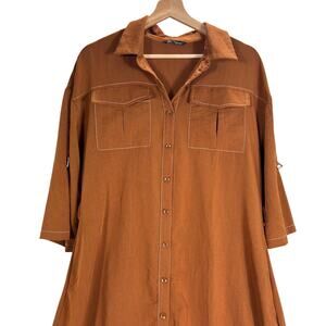 Pretty Garden Medium M Rust Brown Shirt Dress Pockets Roll Tab Sleeve Maxi Collared