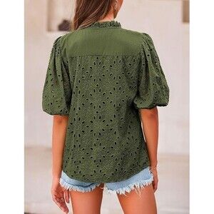 Pretty Garden NWOT eyelet button up tunic top Size XL green puff sleeves Boho