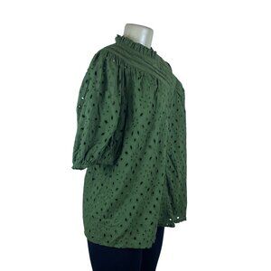 This Pretty Garden blouse features a stylish green eyelet design crafted from 100% cotton for breathability, with a polyester lining for added comfort. The blouse has a high ruffled neckline, functional front buttons, and short puffed sleeves, giving it a modern yet timeless silhouette. It's brand new with tags attached and includes a spare button. Made in China, this versatile piece is suited for warmer weather.
