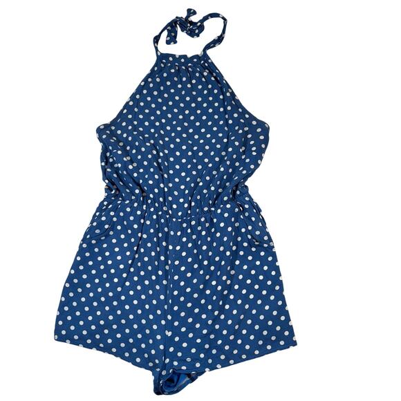 Pretty Garden polka dot halter open back romper. Size M. Blue and white.