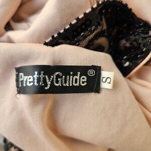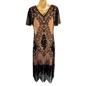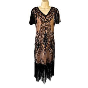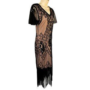 Pretty Guide 20s Sequin Fringe Flapper Dress Sz S Short Slv Black Overlay Pink