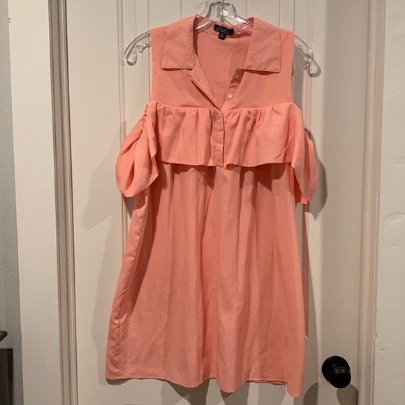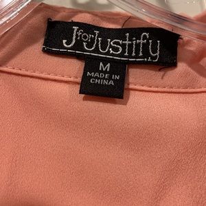 J for Justify peach whimsical knee length dress. Sophisticated collar with fun shoulder ruffles.