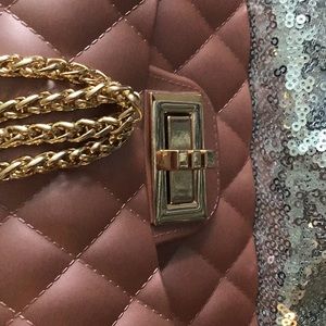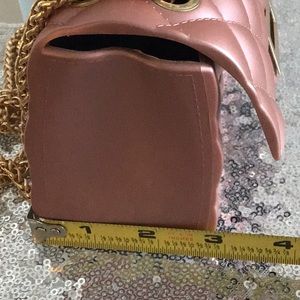 Rose gold with Gold chain; cross body or doubled for over the shoulder or as small hand purse. Beautiful gold closure. Divided pocket inside fits everything you need for a night out; from compact, lipstick, a small card wallet and if you’re anything like me...penny candy! Shiny PVC in a quilted design lends to the appearance of a satin quilt purse, yet its durable and easily cleaned with a warm damp cloth. Gold chain strap 12” when doubled up. Purse size 7”x3”x4”